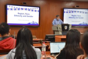 9月18日在“为什么英语没有成为美国的官方语言?”的讲座中,凯茨曼教授结合美国社会和历史的发展探究英语在其过程中逐渐形成的多种特点, 包括外来语、发音、习语搭配以及使用规律等。 9月20日题目为“美国社会生活中地域、种族、族裔以及性别的相互能动影响”的讲座从社会学的多维视角审视了多种社会因素之间的相互影响和作用,以及美国种族关系的复杂性和长期性。凯茨曼教授在9月24日题为“美国课堂上教师和员工角色互换”的讲座中和在场的师生听众一起探讨了目前高校教学以员工为主,教师为辅的现代高等教学理念及其实例研究分享。