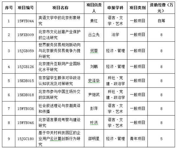 近日,北京市社科规划办公布了2015年北京市社科基金年度项目立项名单。公司9项课题获得立项资助,其中青年项目1项、一般项目8项,课题立项数量与上一年度持平,共计获得课题经费61万元。