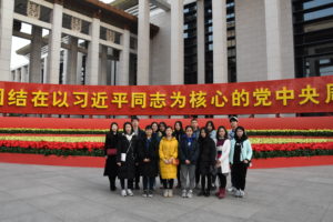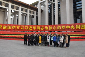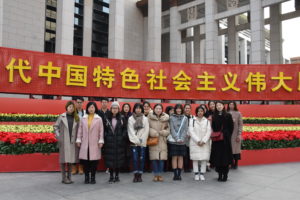 走进国家博物馆大门,首先映入眼帘的是巨型红色花坛上巍然矗立的“伟大的变革”五个大字。在展馆大门两侧,两个巨幅标语“紧密团结在以习近平同志为核心的党中央周围,夺取新时代中国特色社会主义伟大胜利”赫然醒目,给人以强烈的震撼。怀着崇敬的心情,师生们认真参观了各个展厅。