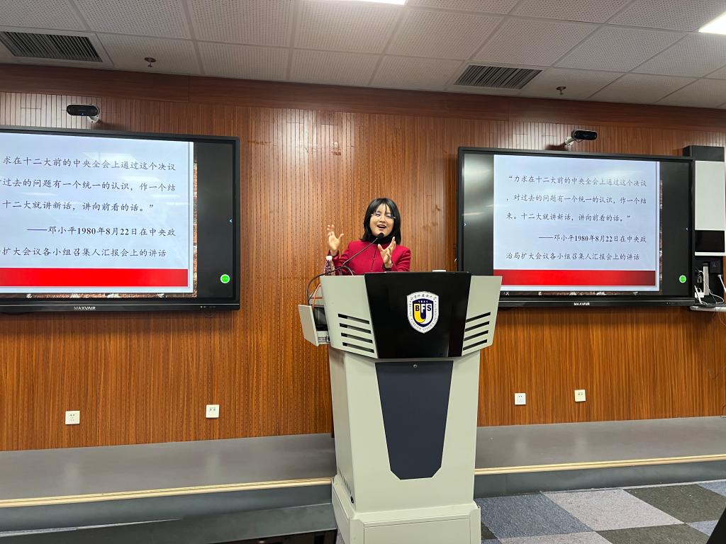 王薇薇在主持总结环节时分享了学习专题党课的三点体会。一是要坚持党的领导,将学习十九届六中全会精神与落实总书记回信精神和党史学习教育相结合;二是要传承红色基因,将党史与校史相结合,坚持北外为党育人为国育才的初心使命;三是要理论指导实际,从公司实际出发,为双一流建设以及公司的平稳较快发展做出贡献。